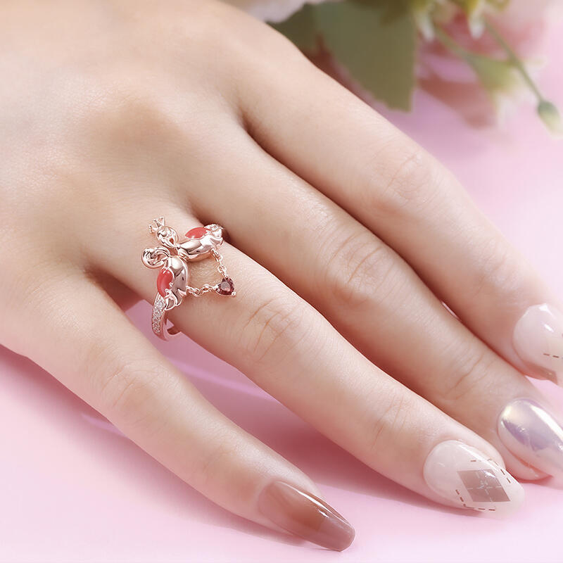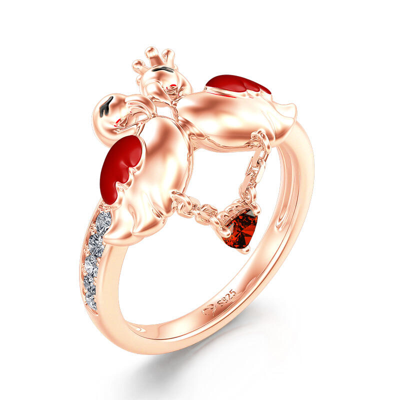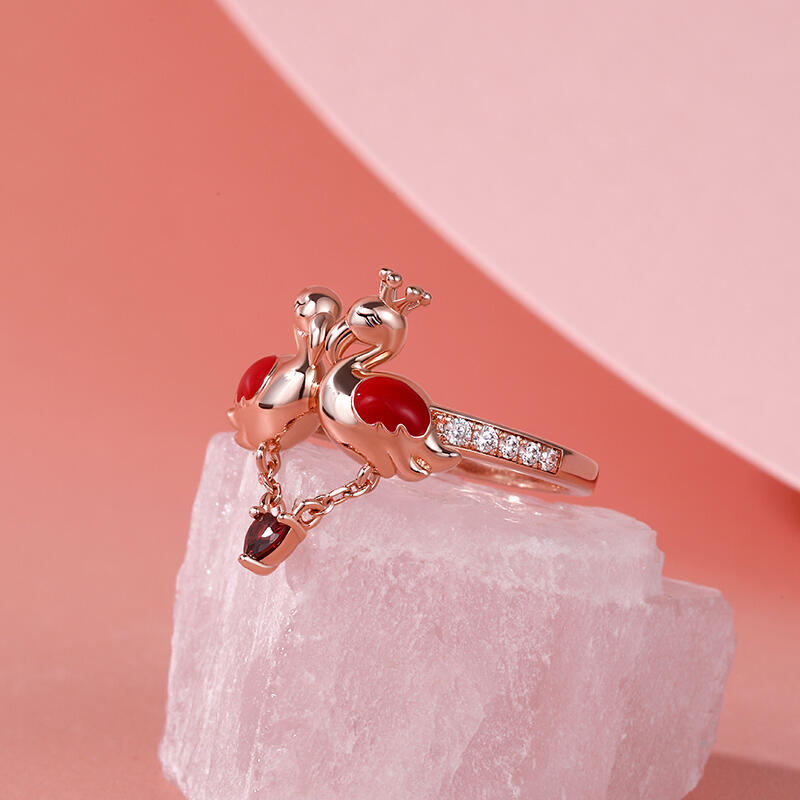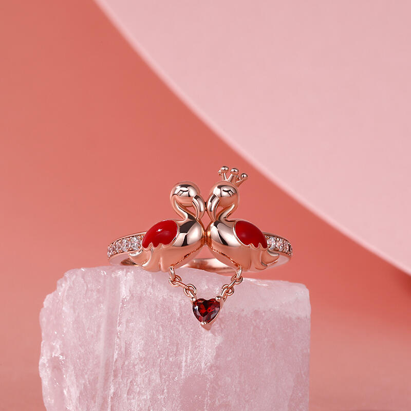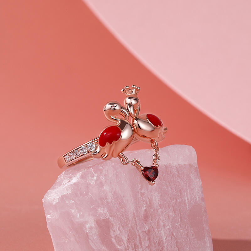 In any case, encountering flamingos can be an omen of good things to come, or a warning to make some changes. Flamingos are often symbolic of romance. Encountering flamingos, especially in pairs, is often a positive omen of romance on the horizon. Made in rose gold tone sterling silver and precious stones, the band features romantic flamingo couple enjoying together. The heart-cut stone as charm on this band: it gently moves with you as you go through your day. As a great gift for Valentine's Day, the meaningful ring celebrates your everlasting love.